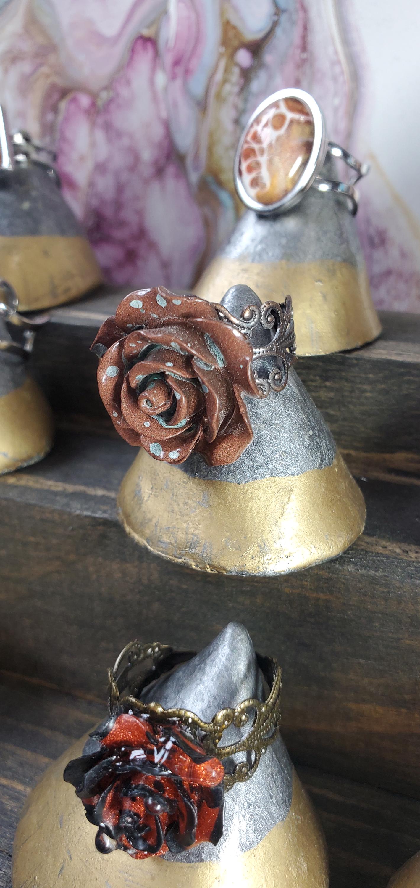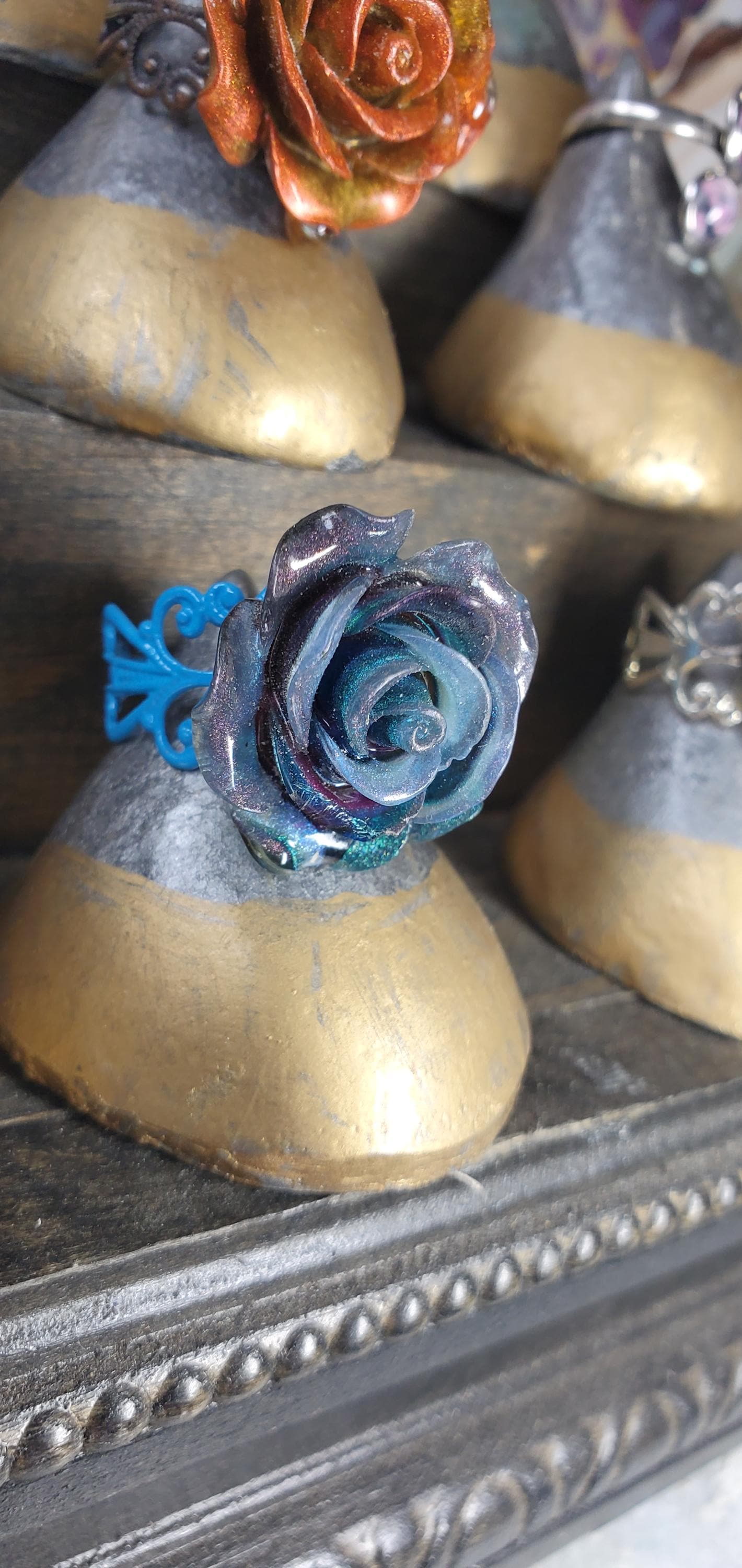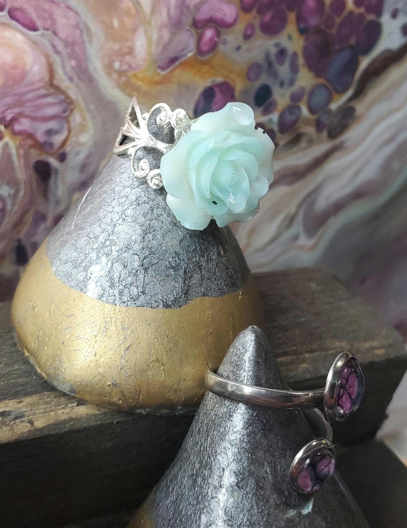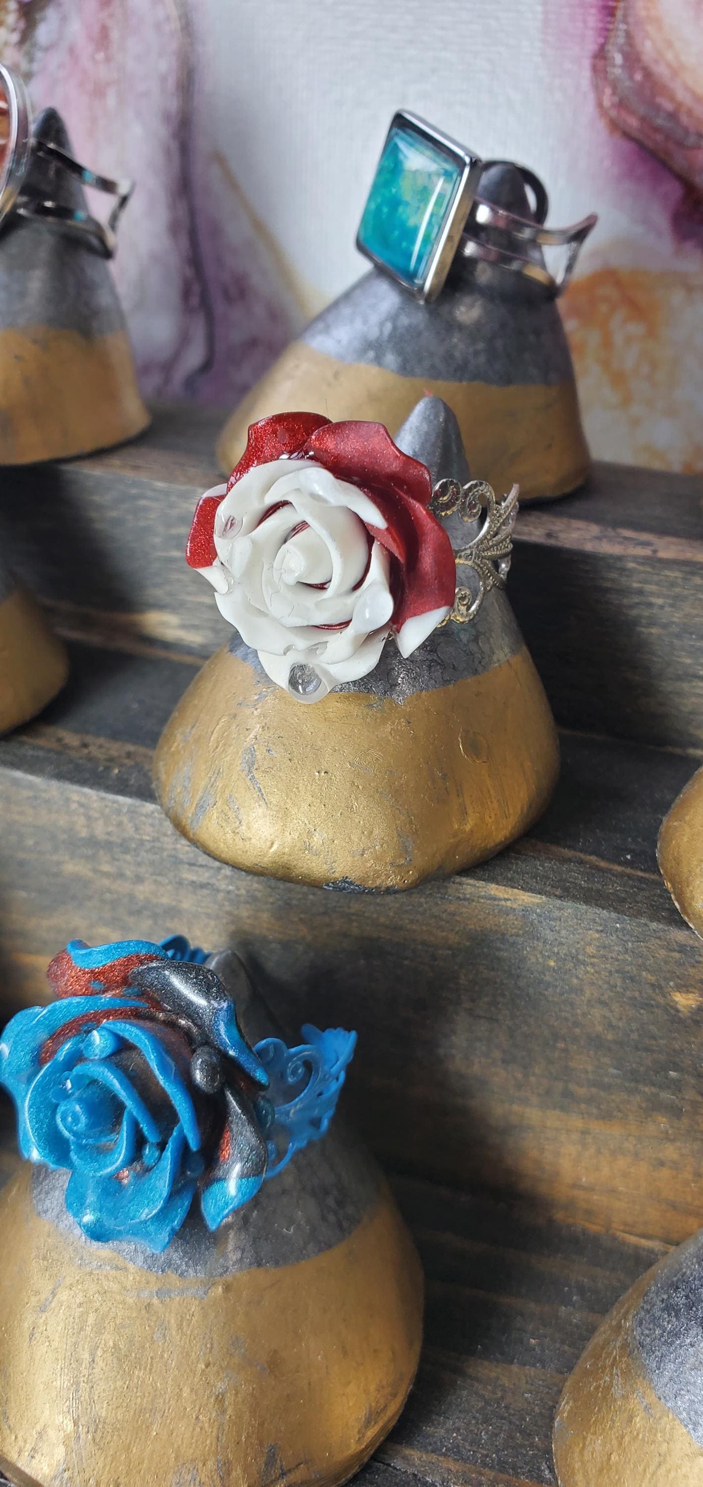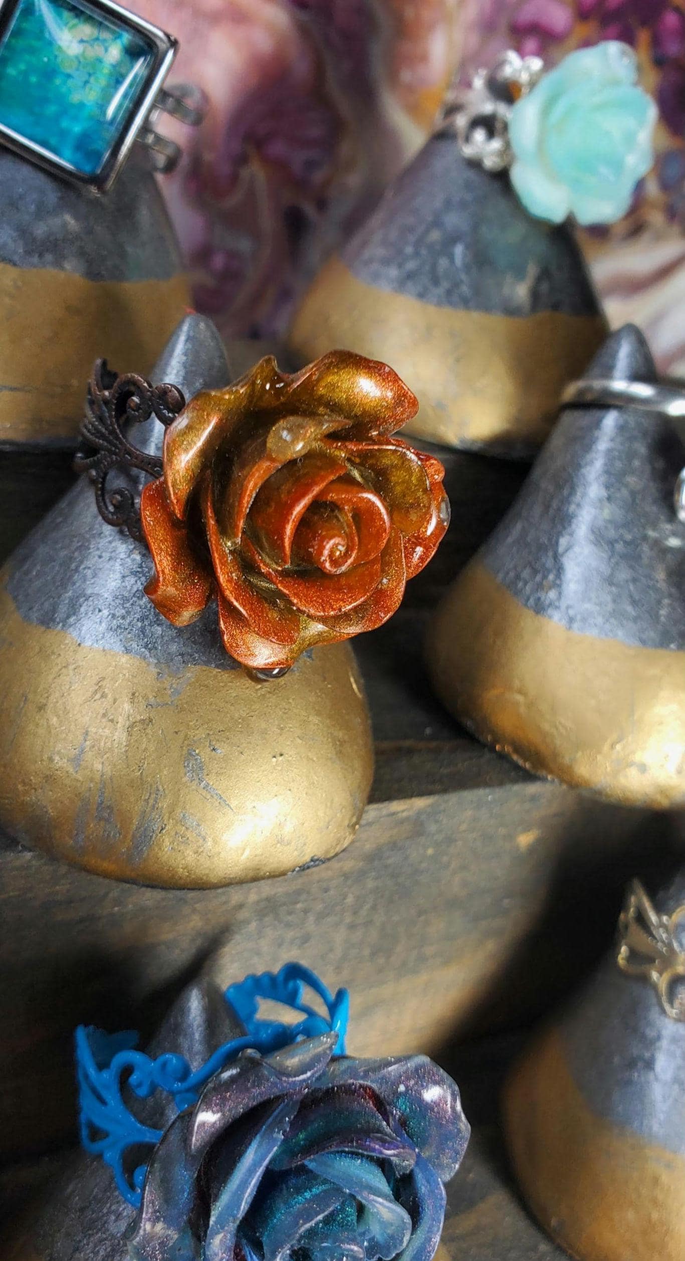 one of my best-sellers! Each of my rings is poured individually so you'll get stacks of vibrant colors and each ring will be very unique. I have even created the molds they are poured in myself so you know each ring is hand crafted with care and love. The roses are made in medium and large-you can see the size comparisons in the photos, and labels in the photos. Let me know if you'd like more photos of any of my pieces! These rings will add a great flare to your outfit and they get so many comments! This listing is for your choice of one ring option.