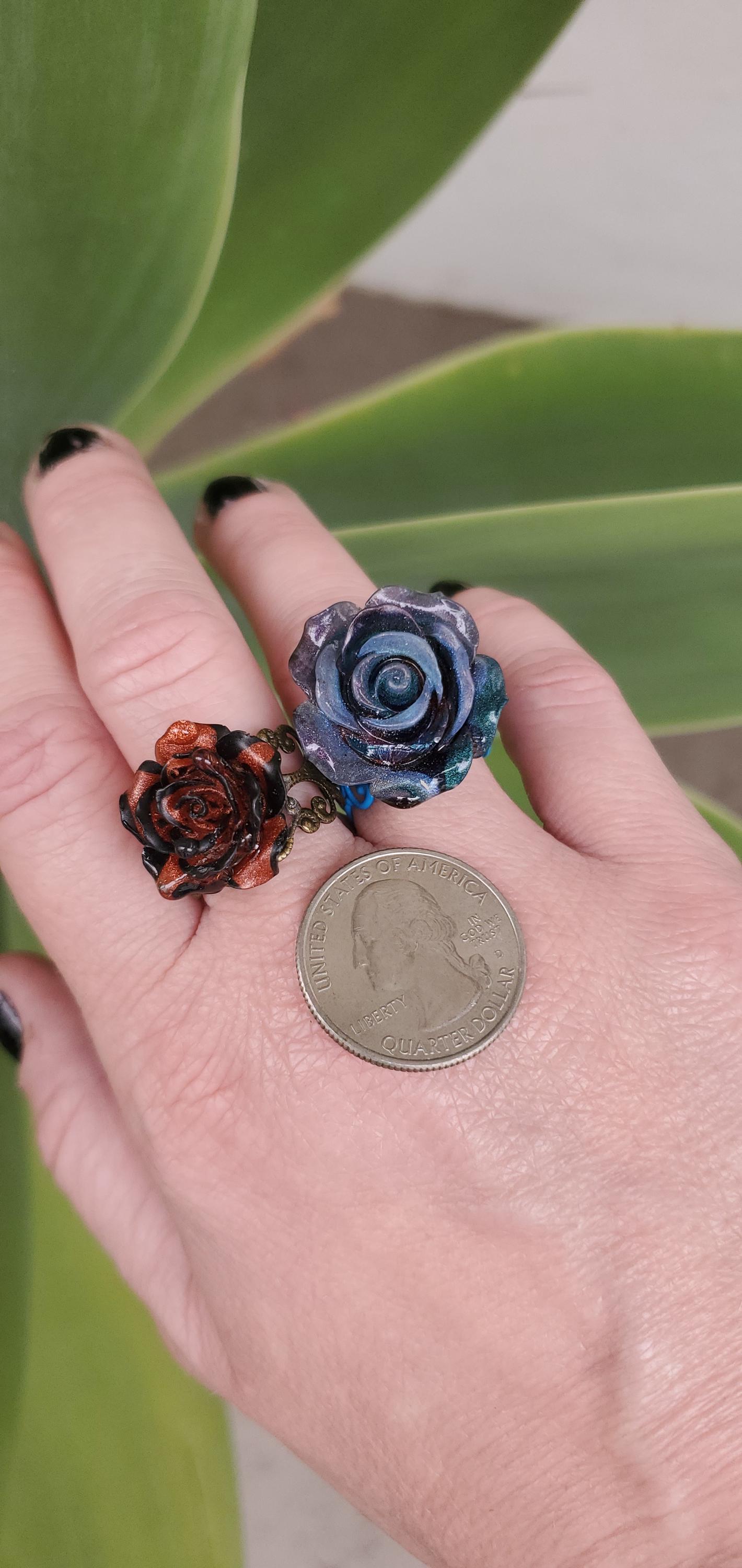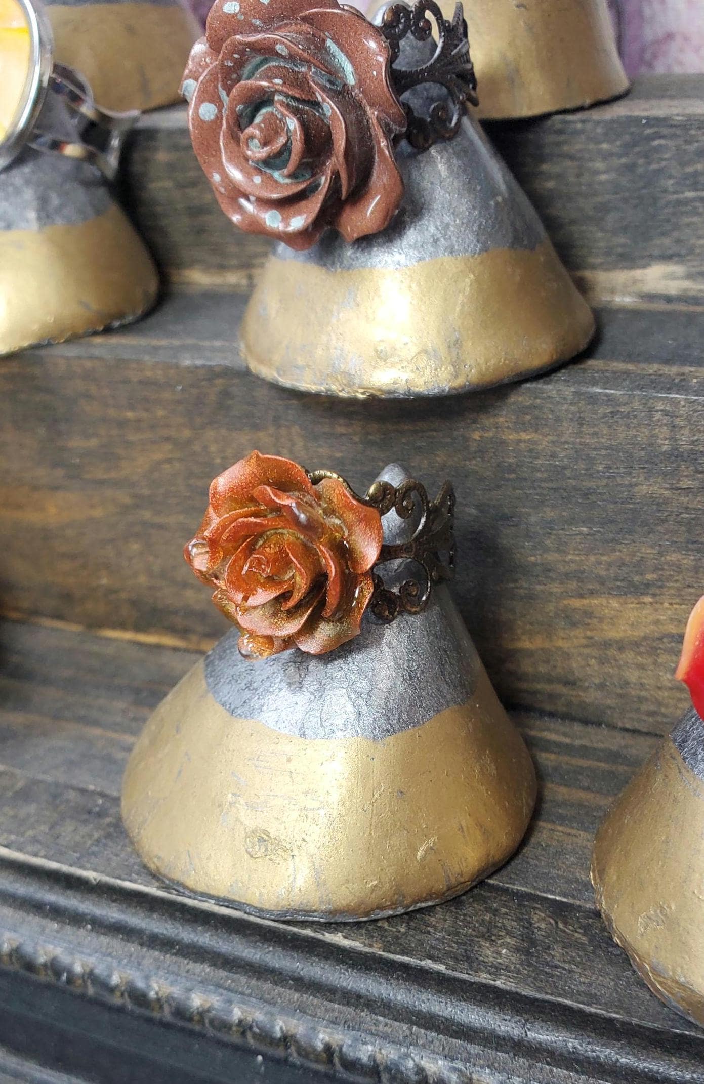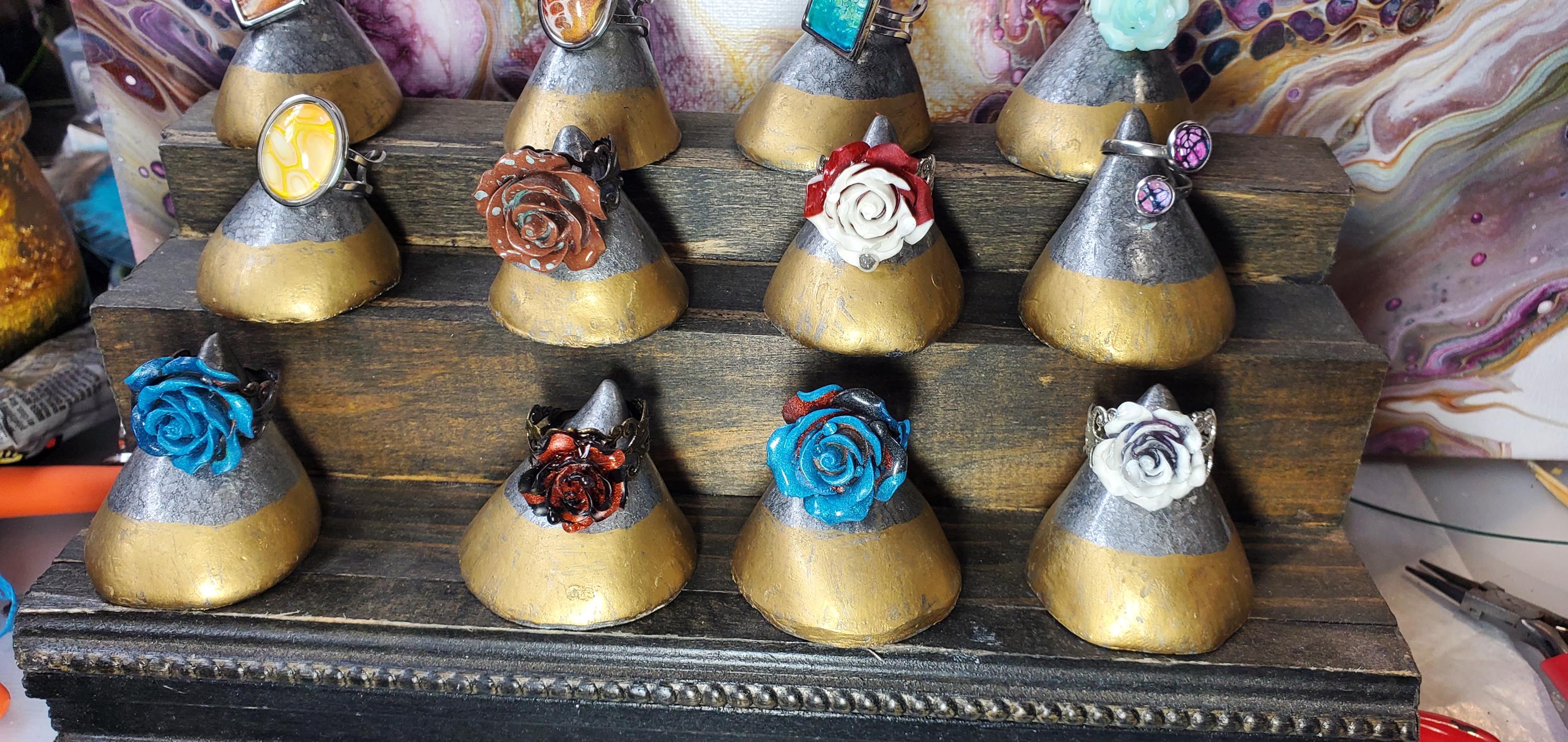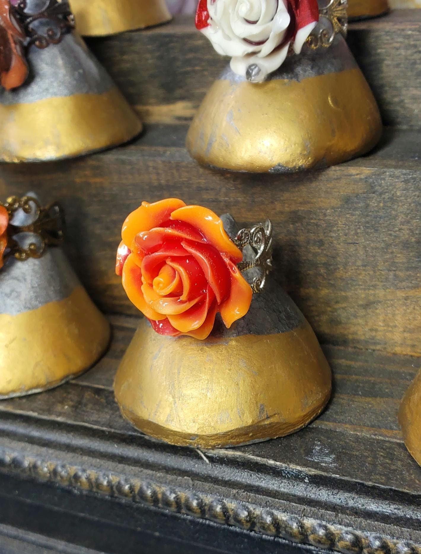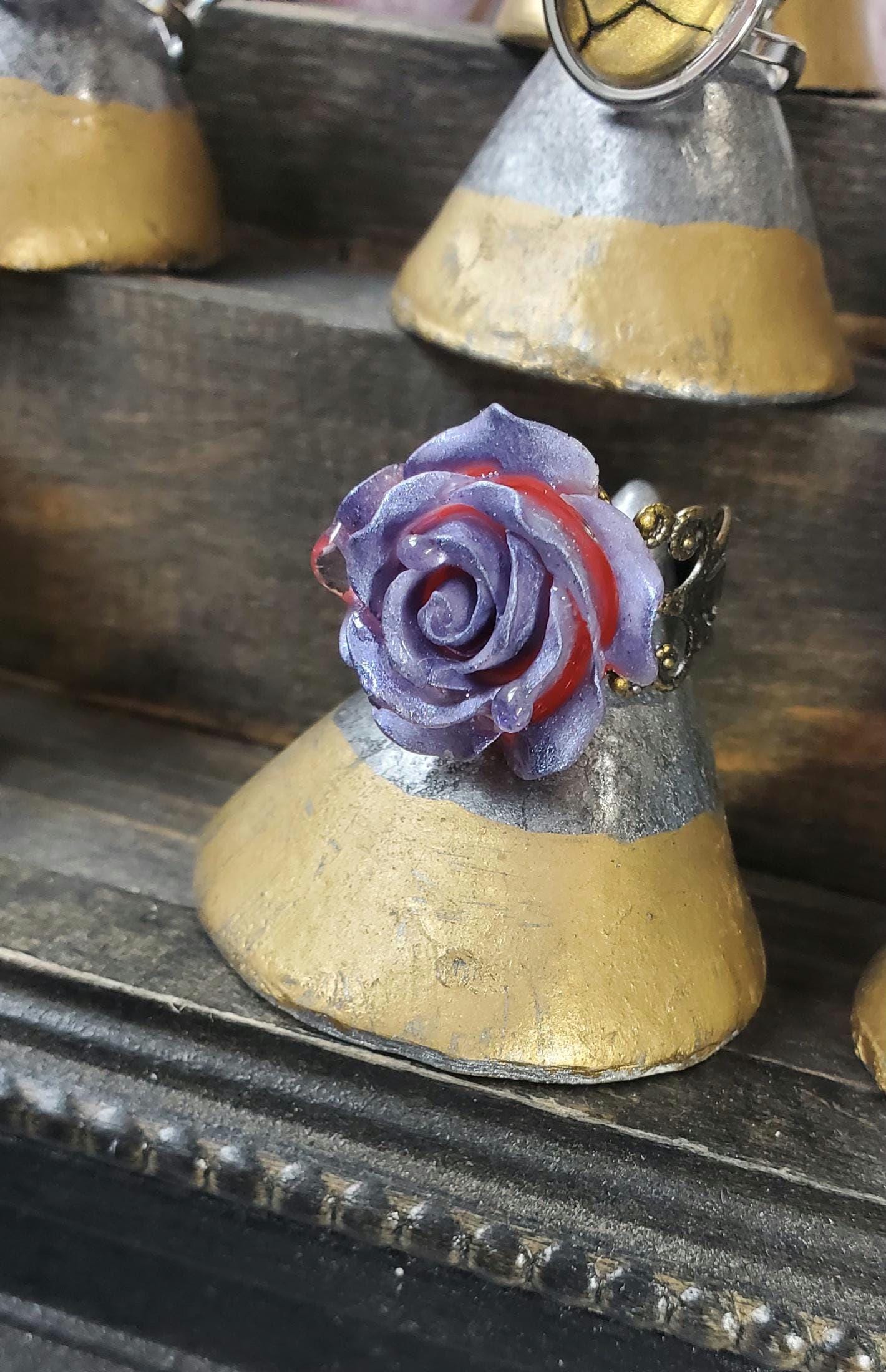 one of my best-sellers! Each of my rings is poured individually so you'll get stacks of vibrant colors and each ring will be very unique. I have even created the molds they are poured in myself so you know each ring is hand crafted with care and love. The roses are made in medium and large-you can see the size comparisons in the photos, and labels in the photos. Let me know if you'd like more photos of any of my pieces! These rings will add a great flare to your outfit and they get so many comments! This listing is for your choice of one ring option.