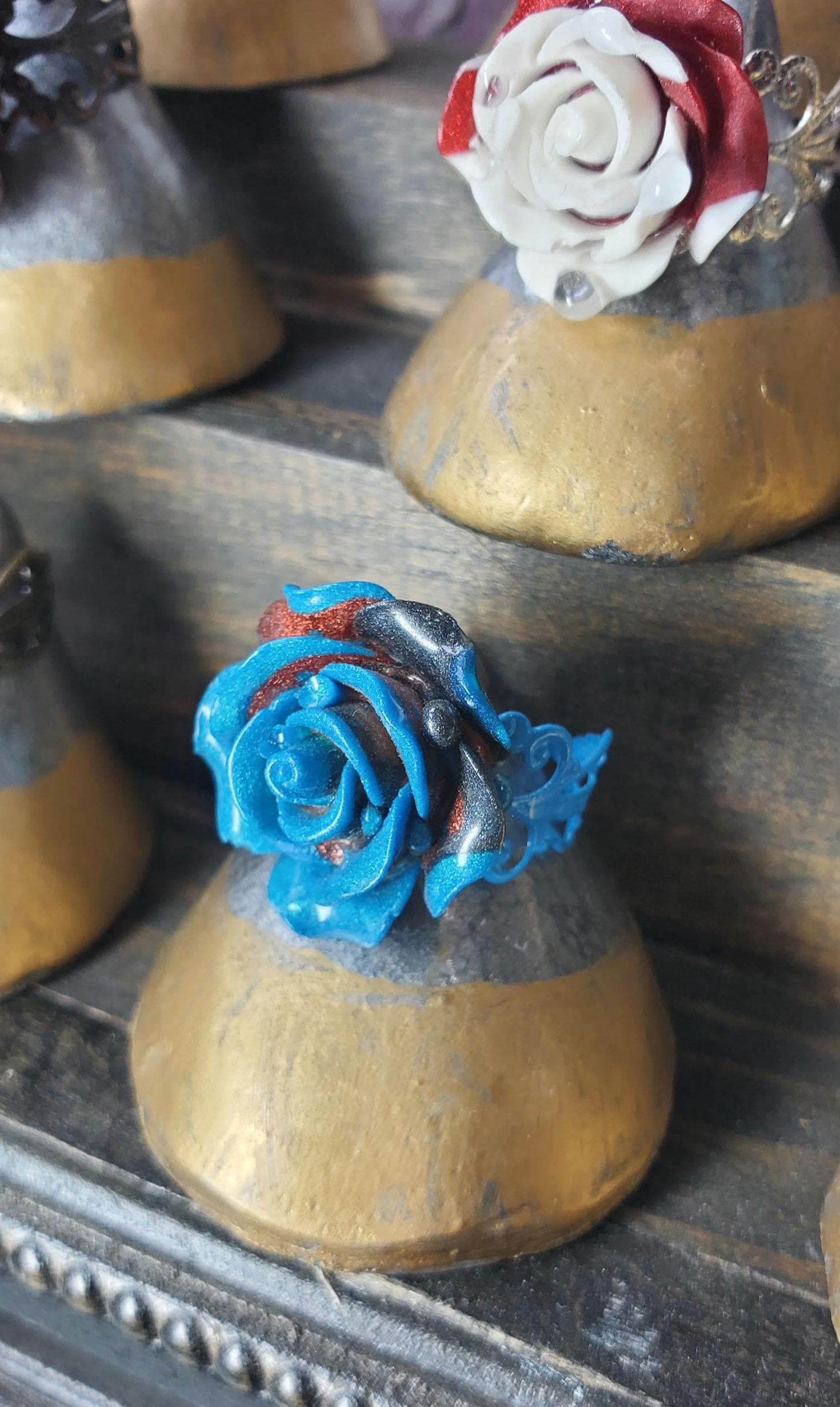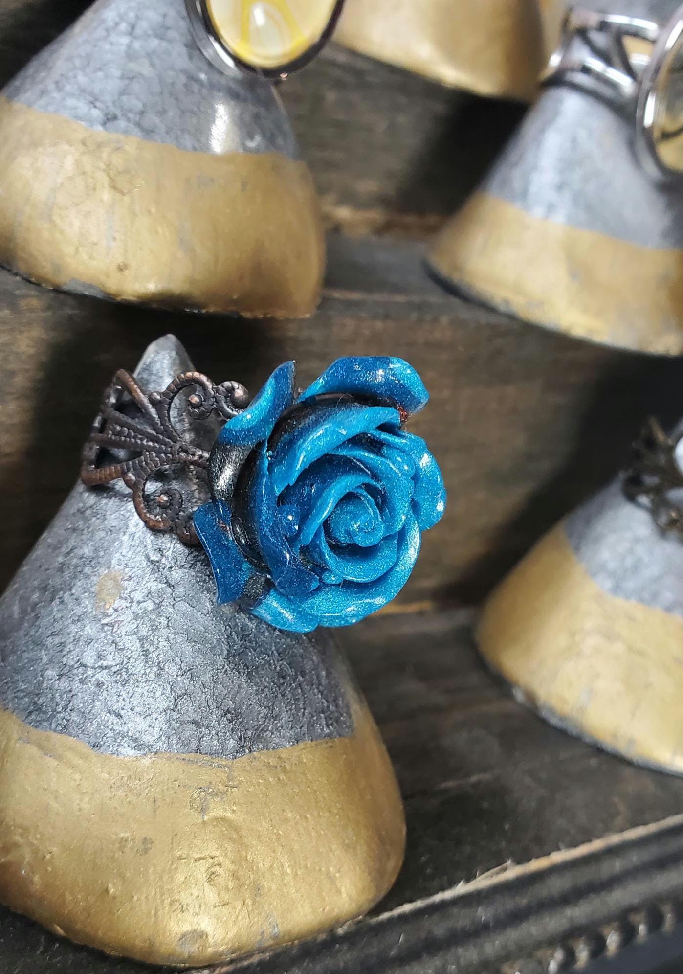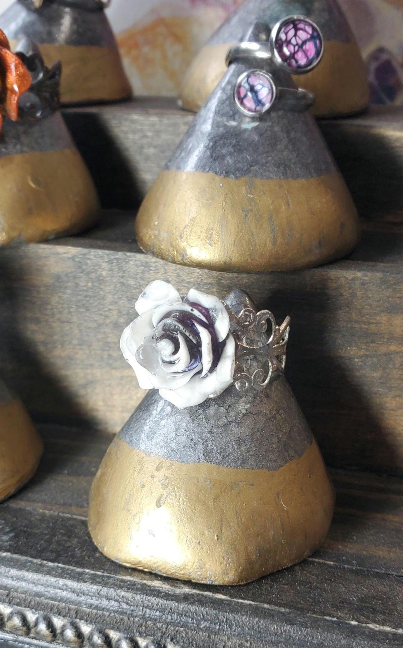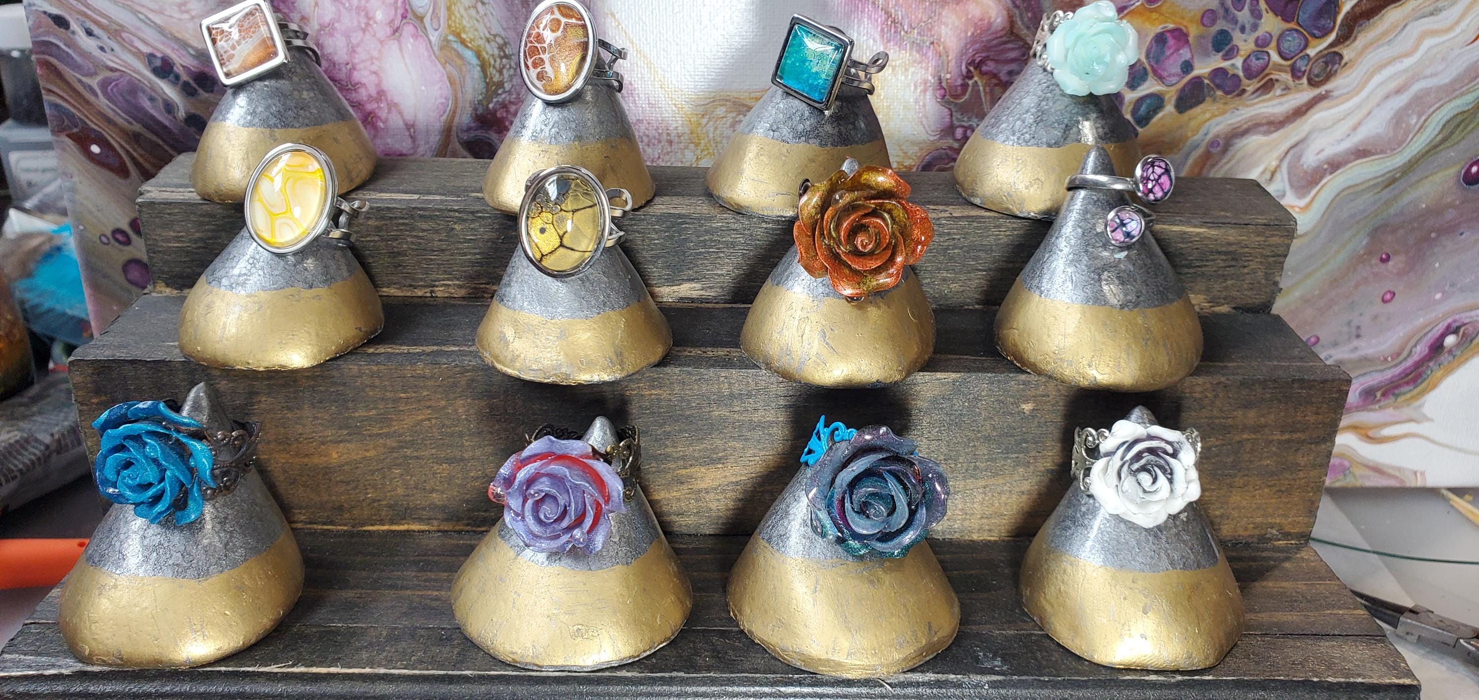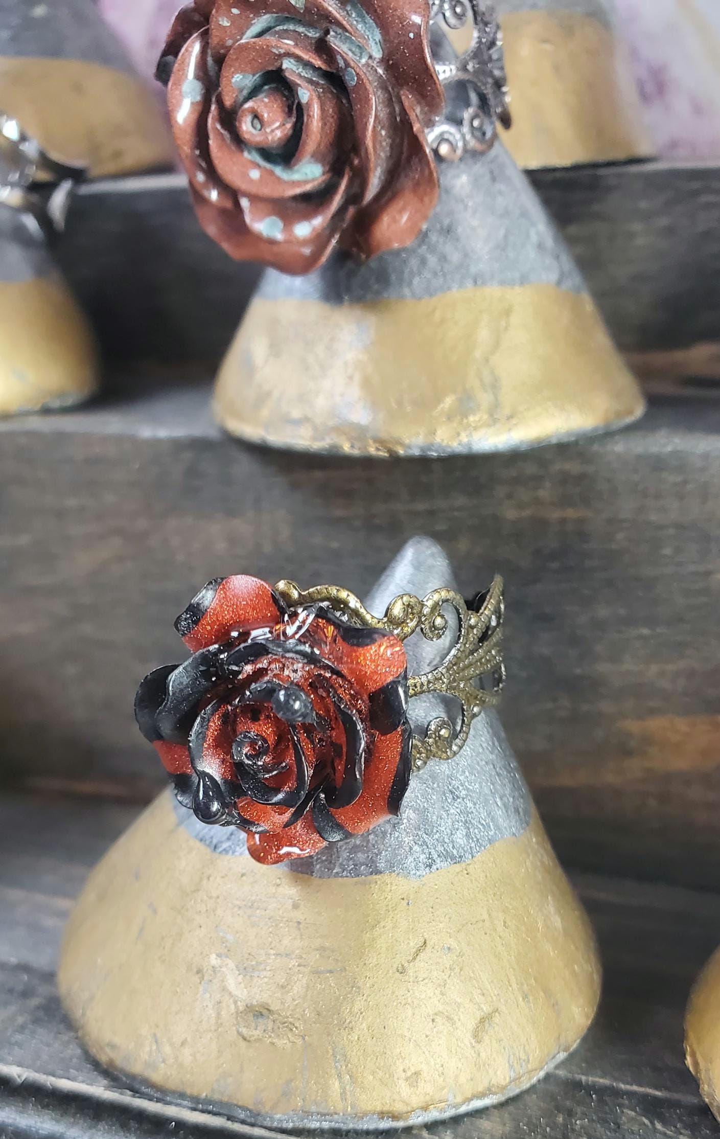 one of my best-sellers! Each of my rings is poured individually so you'll get stacks of vibrant colors and each ring will be very unique. I have even created the molds they are poured in myself so you know each ring is hand crafted with care and love. The roses are made in medium and large-you can see the size comparisons in the photos, and labels in the photos. Let me know if you'd like more photos of any of my pieces! These rings will add a great flare to your outfit and they get so many comments! This listing is for your choice of one ring option.